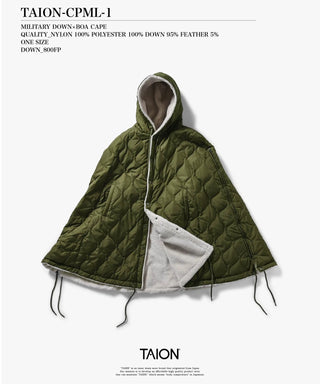 | 商品の特徴 | ミリタリー ダウンケープ / コヨーテ×ベージュ [TAION-CPML-1]。TAION タイオン ミリタリー ダウンケープ。ブランド古着】TAION / タイオン 24AW TAION-CPML-1 MILITARY。taion ミリタリーケープポンチョ購入してから着用する機会なく、自宅保管品しておりますタグは外してます期間限定お値下中です これ以上のお値下はできませんのでご了承くください自宅保管品のため、畳じわついております神経質な方は御遠慮ください圧縮して発送させていただきます軽量で保温性に優れたTAIONのユニセックスダウンケープ、ベージュ- ブランド: TAION- モデル名: CPML-1- 素材: ナイロン- サイズ: ユニセックス- カラー: ベージュ- 特徴: 軽量・保温性ご覧いただきありがとうございます。Amazon | [TAION] タイオン ミリタリー ダウンケープ CPML-1。 | ||